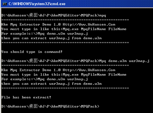 程序使用很简单,假设程序名MPQ.exe,有个mpq文件demo.w3m包含war3map.j要把它解压出来,输入mpq demo.w3m war3map.j即可.