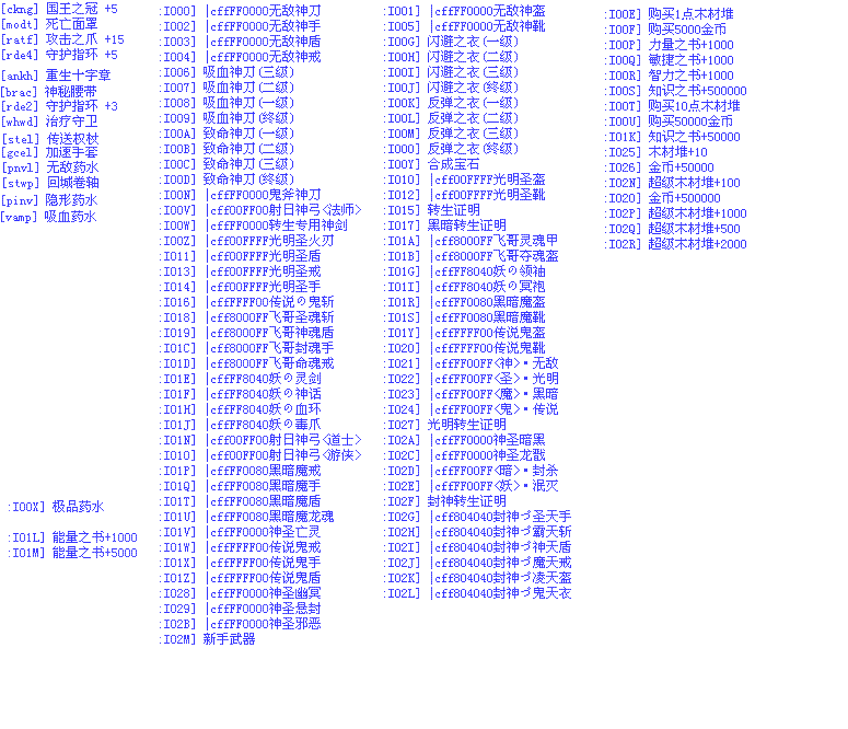 英雄类:加血魔/清除CD/负面Buff(负面魔法效果) 复活英雄 升级 加力量 加敏捷 加智力 加三围 切换背包 复制物品 掉落物品 冲物品 打包物品 设置经验 设置技能点 禁止获得经验